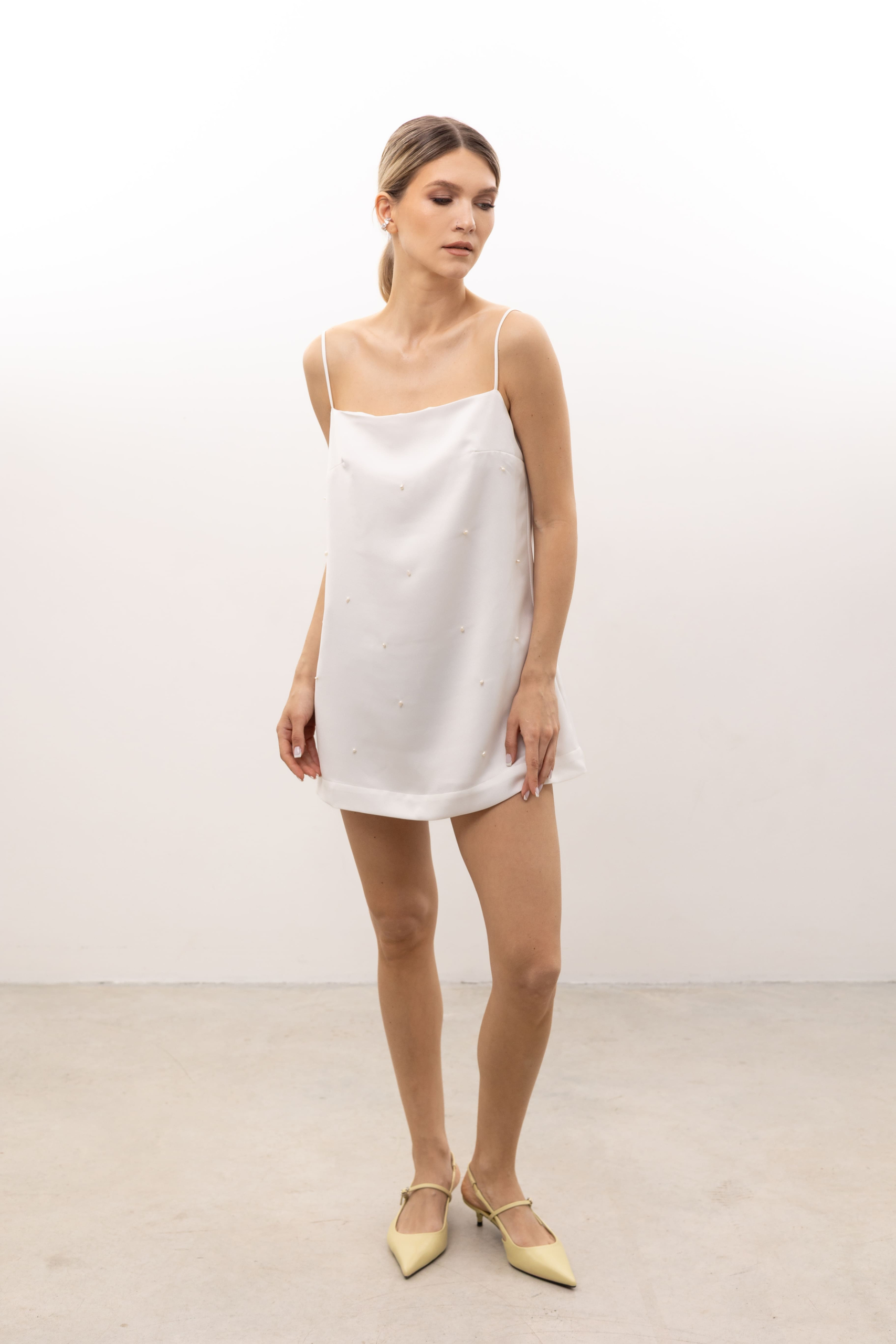 Італійський атлас, розшитий натуральними перлами, тонкі лінії, що створюють тендітний силует — ця сукня створена для окремої сторінки у вашому житті під назвою «літо»