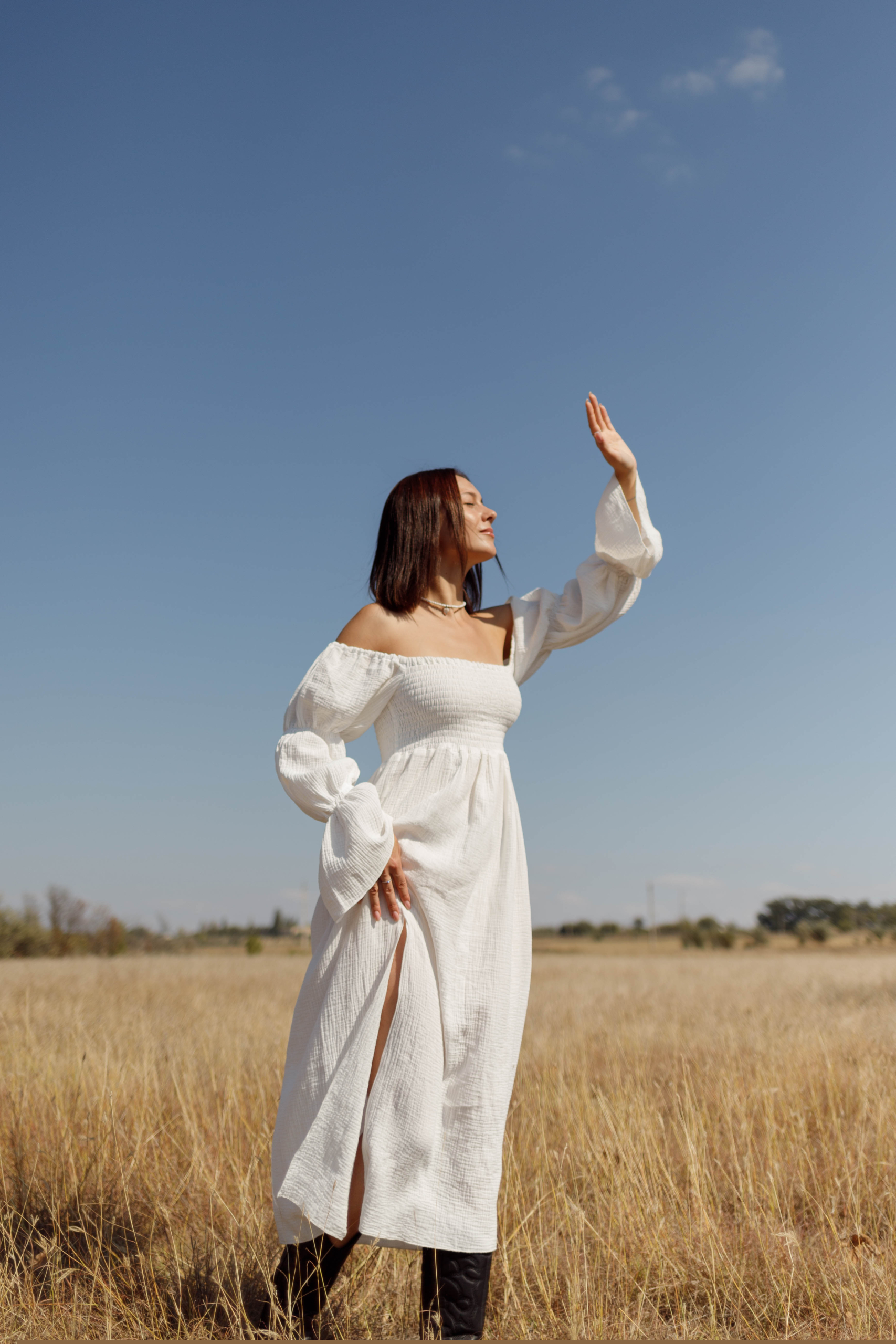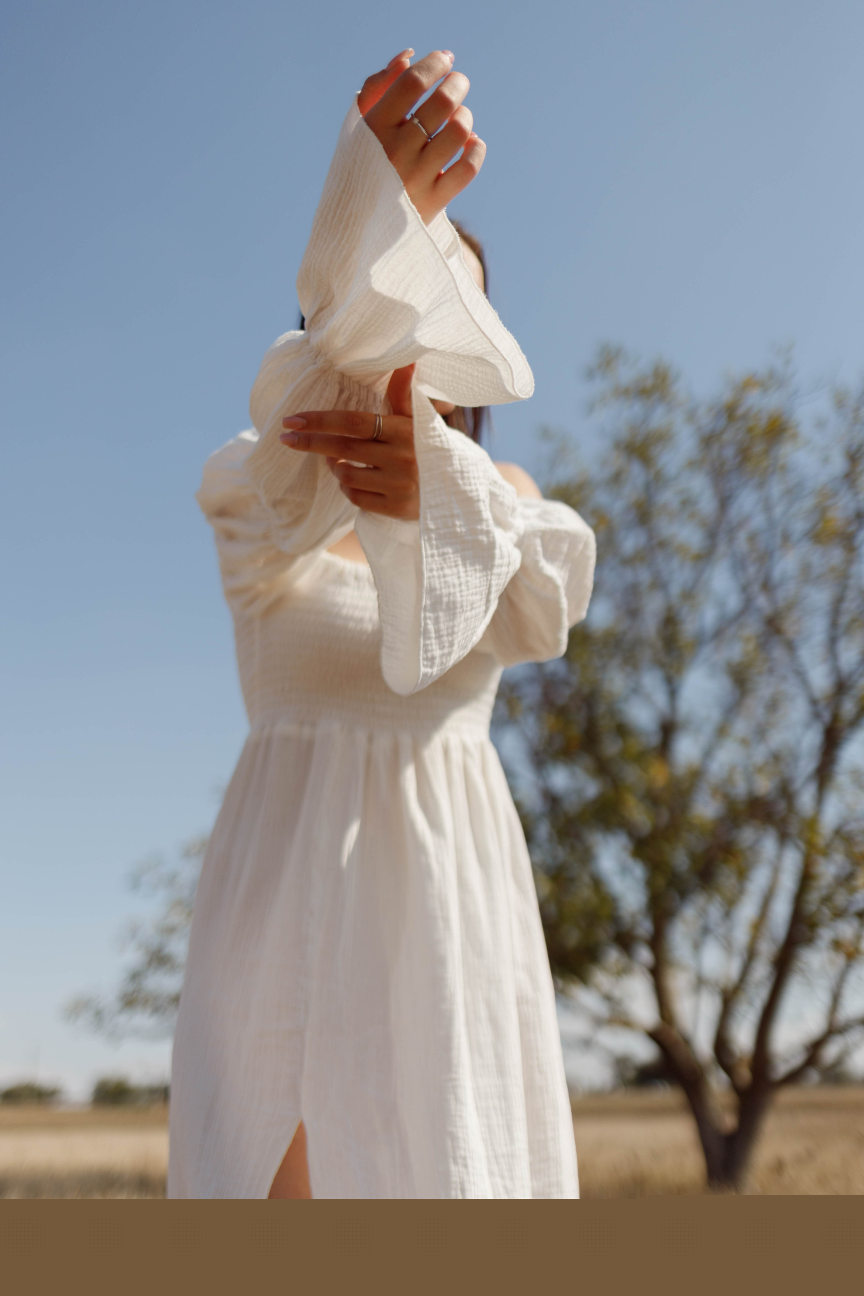 Сукня у довжині міді з розрізом. Подовжений рукав має резинки, завдяки чому можливо регулювати довжину.
