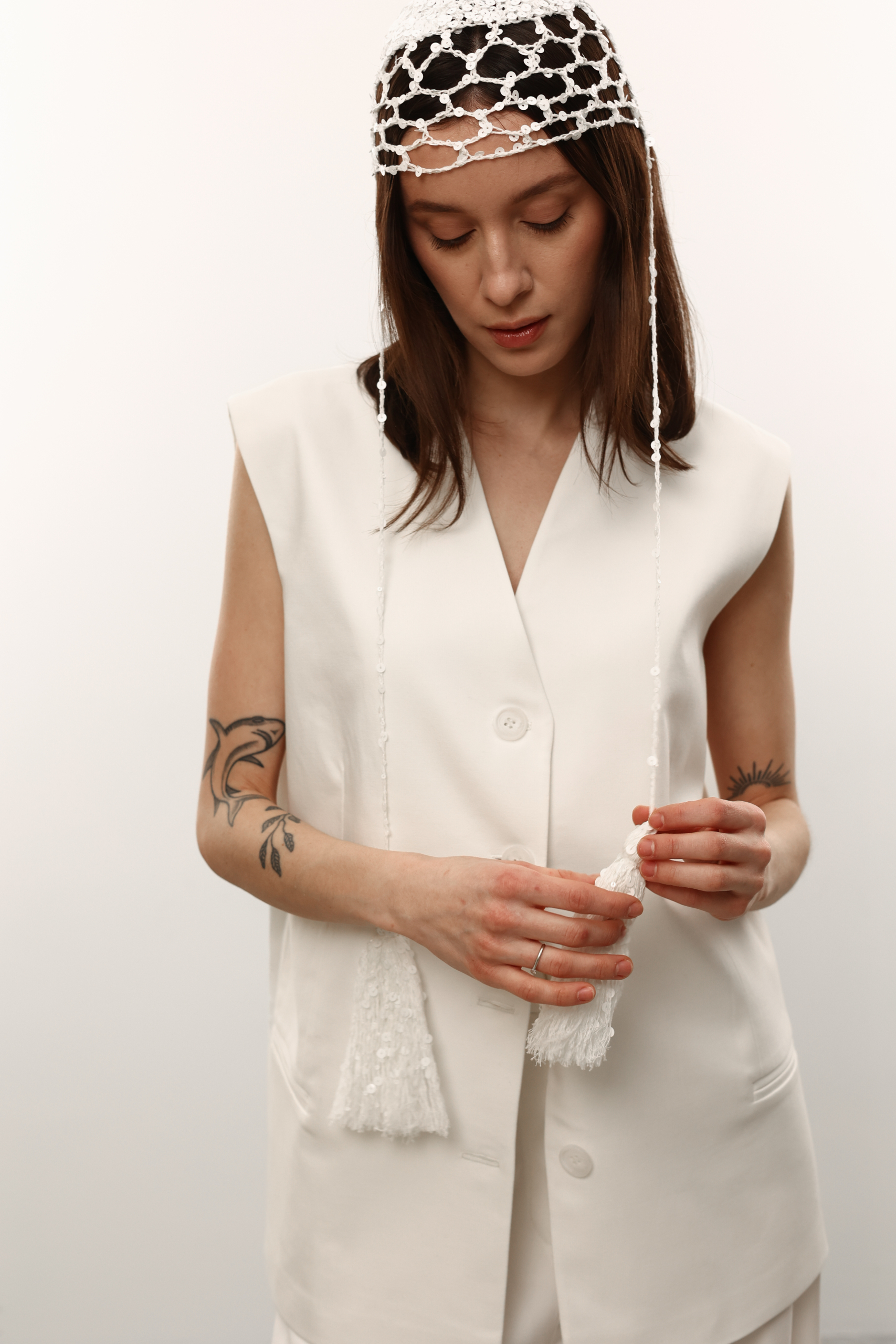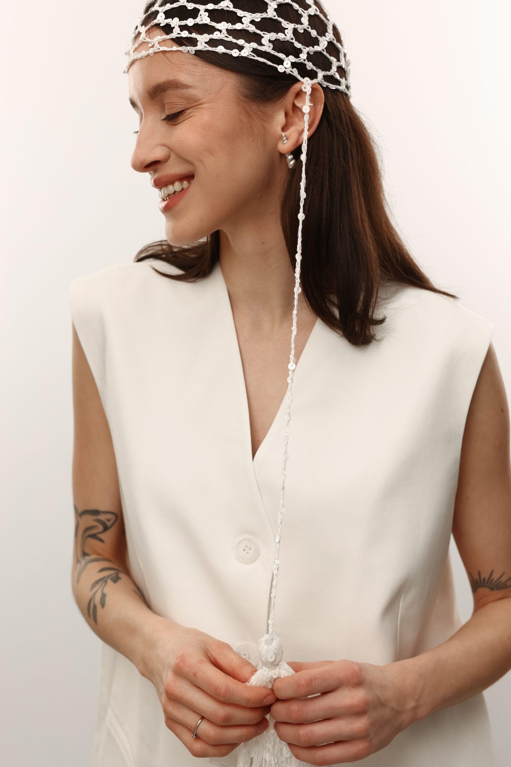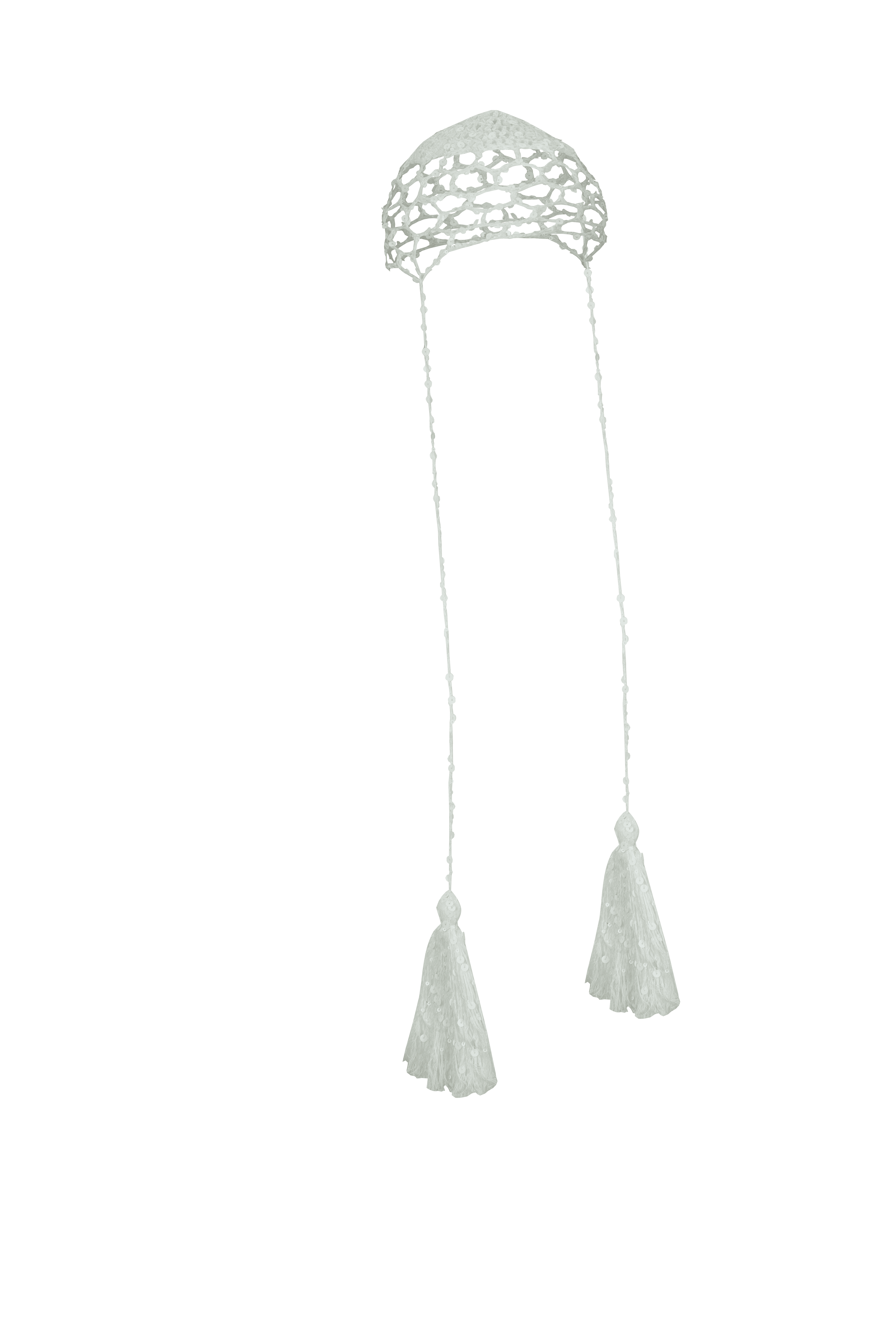 В’язана шапочка з китицями в білому кольорі з лелітками.