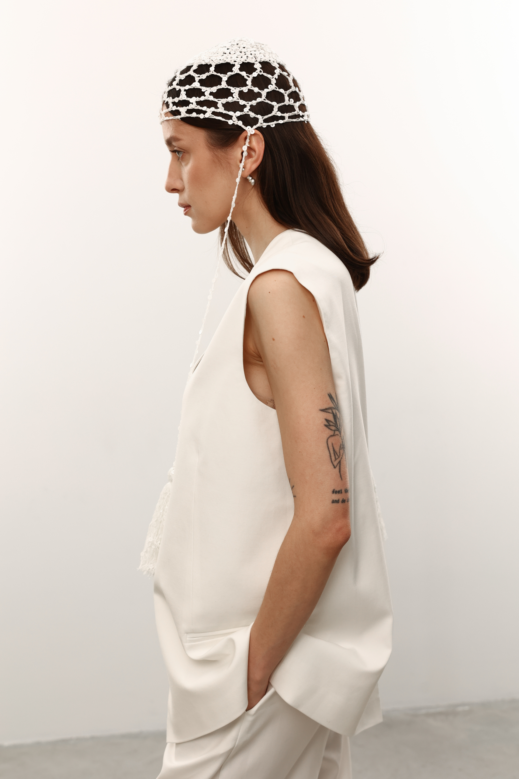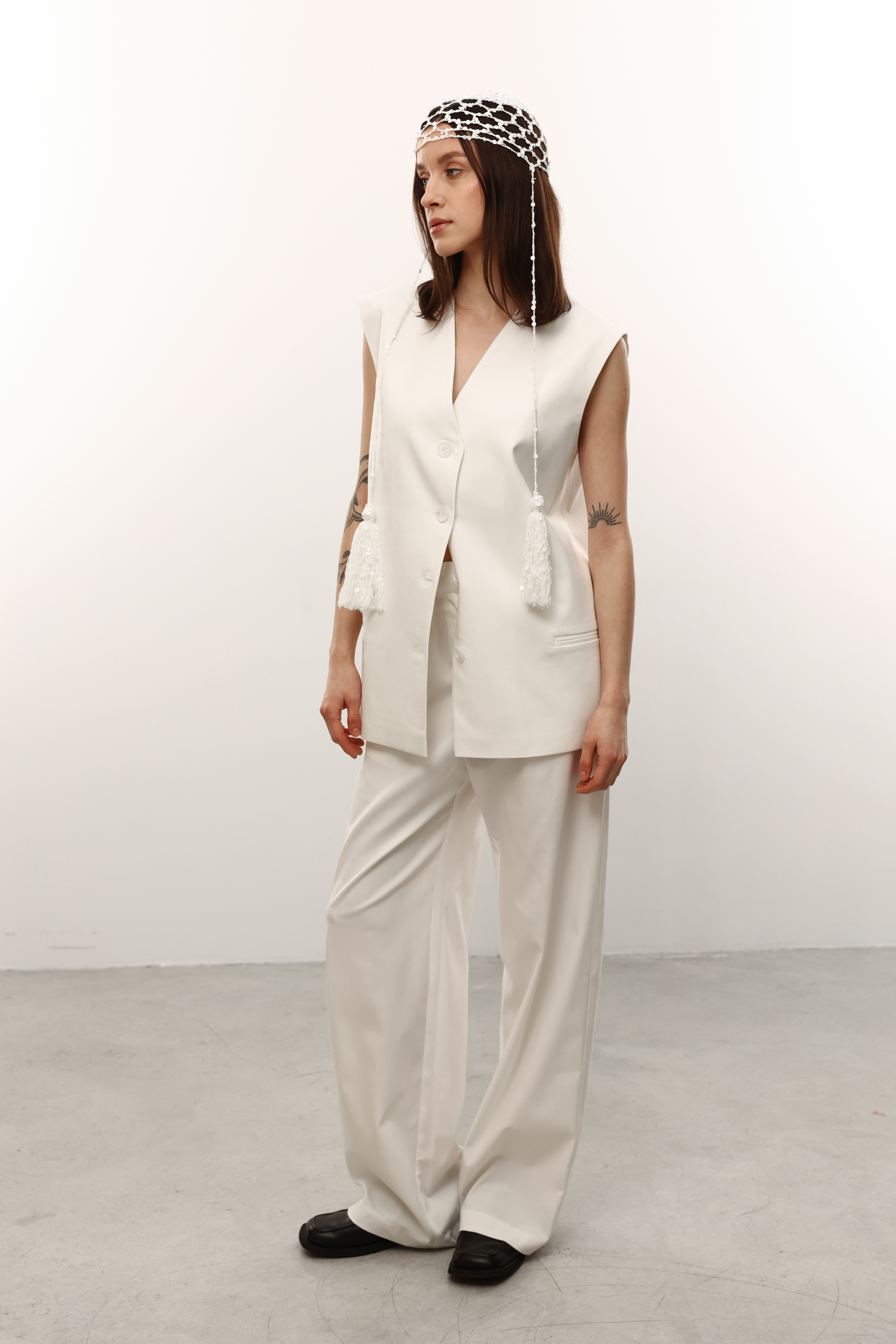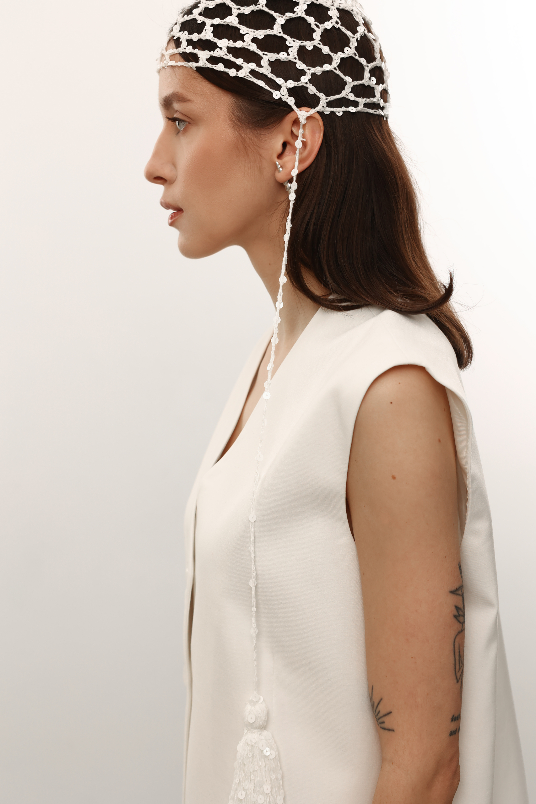 В’язана шапочка з китицями в білому кольорі з лелітками.